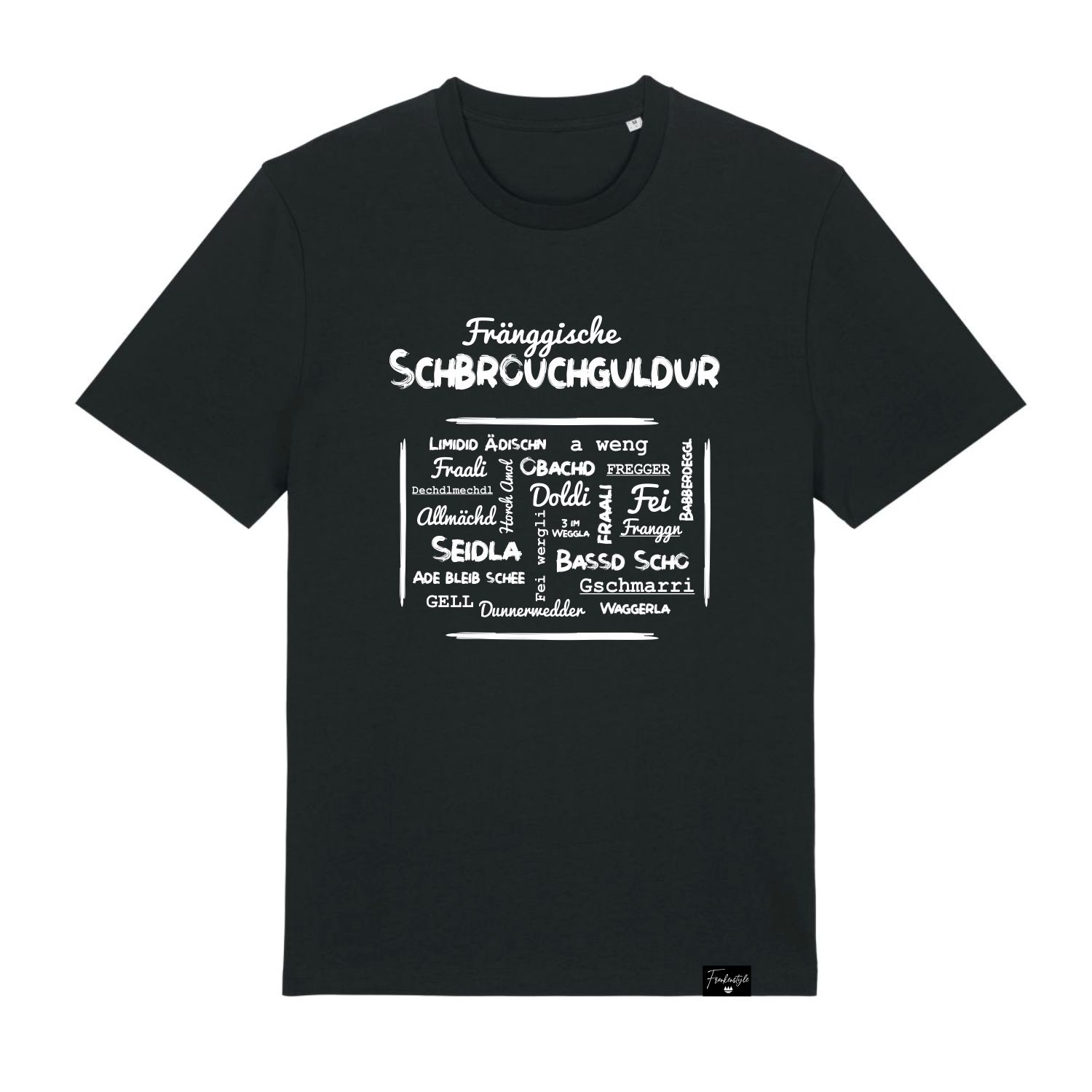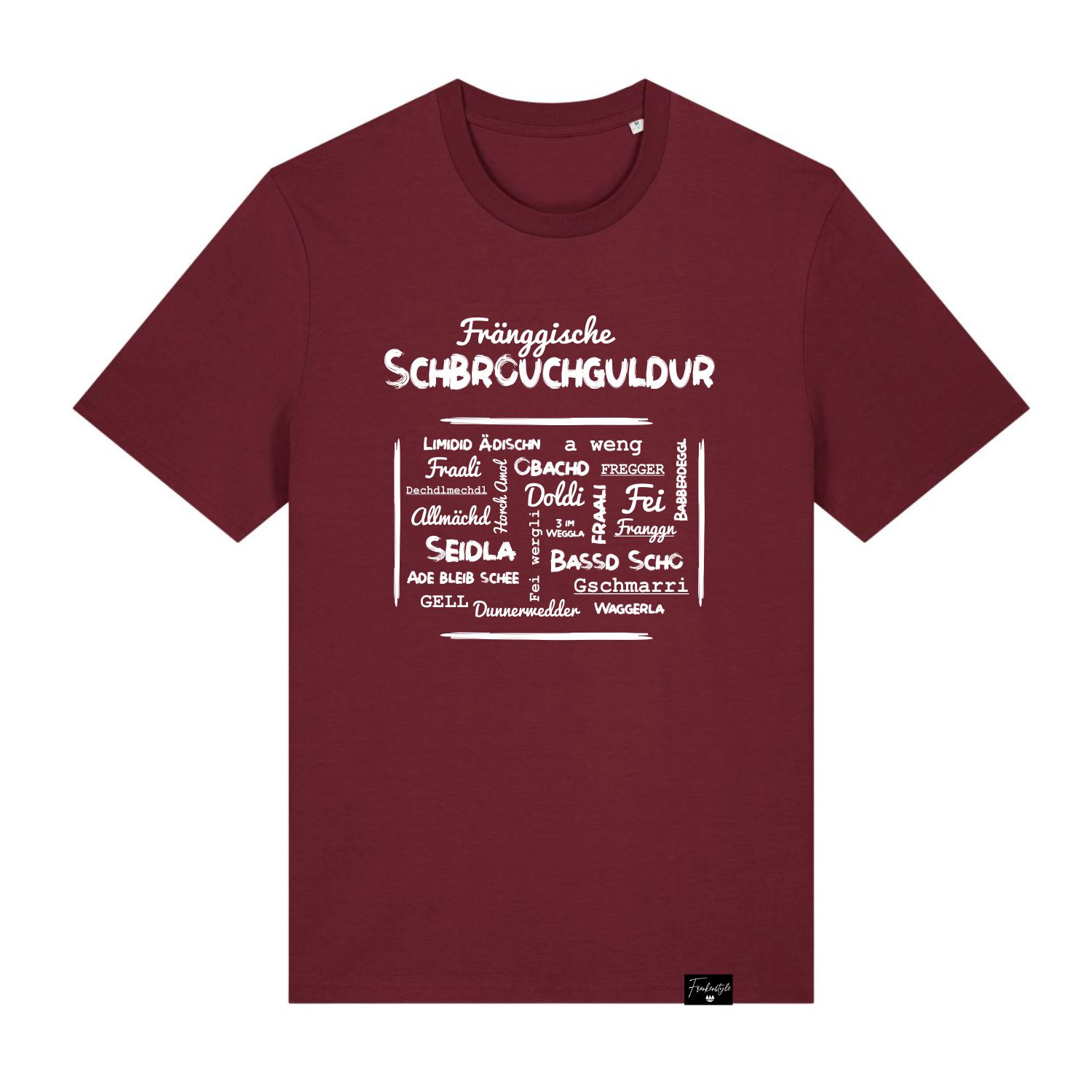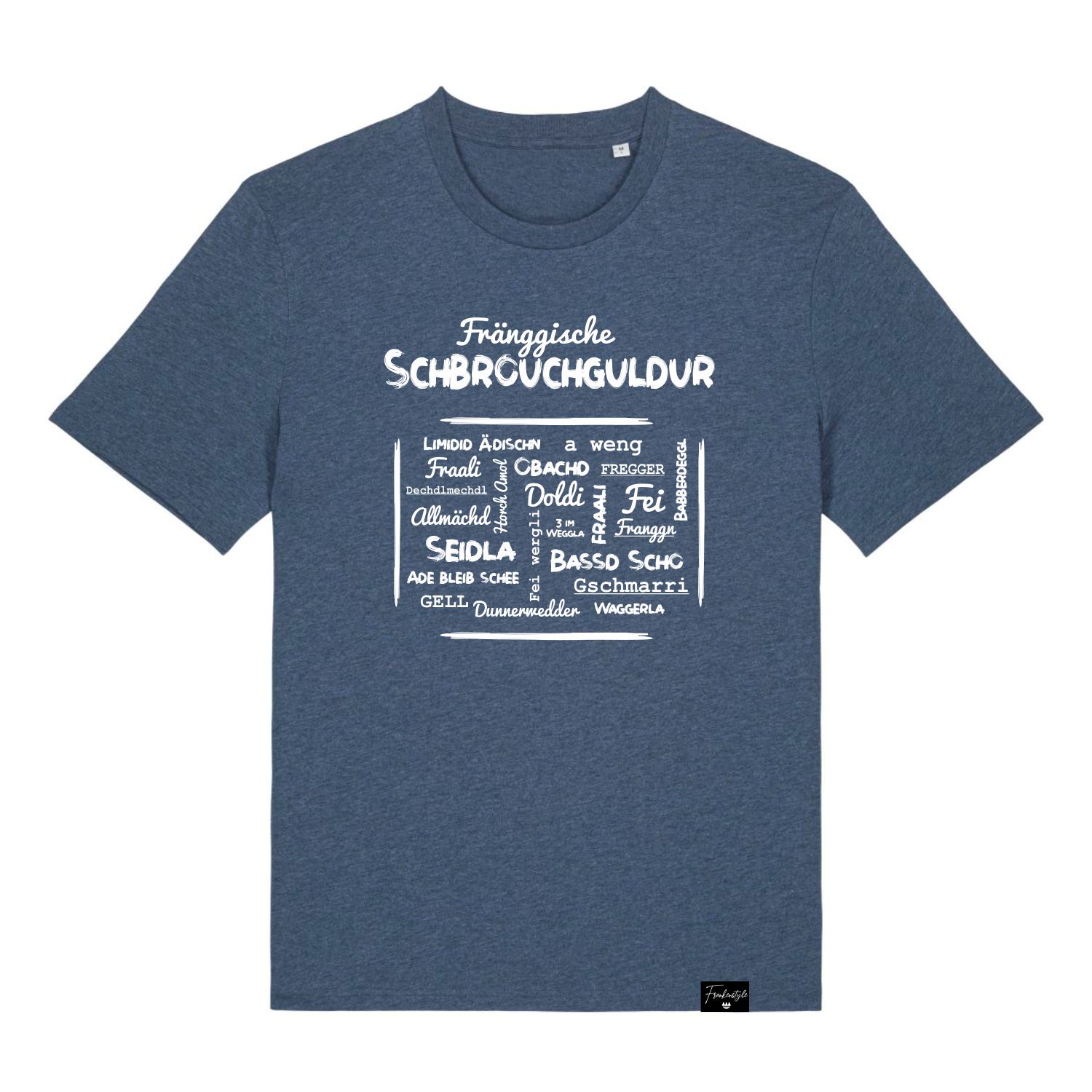 Unser Fränkisches T-Shirt mit den wichtigsten fränkischen Slangbegriffen als Lifestyle Accessoire bringt Deine fränkische Coolness in jeder Lebenslage zur Geltung. Ultragemütlich zu Hause, angesagt beim Weggehen mit Freunden oder als treuer Supporter beim Sport!